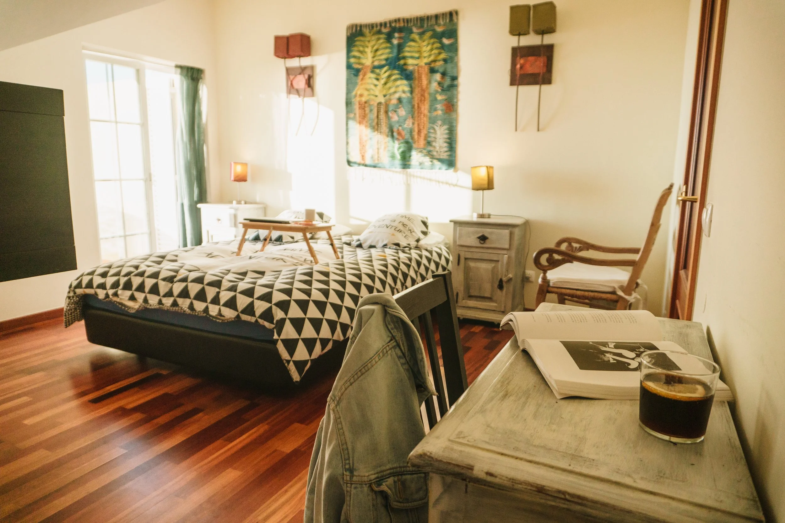 Guests staying in our private apartment can also enjoy full access to the shared spaces of our surf house. This includes our vibrant BBQ area, lively living room with a dartboard, TV, and foosball table, and our comfortable coworking space with high-speed internet. Additionally, you can relax in our large garden, dine with friends, store your surfboards and wetsuits, and cook using our special paella pans. These shared spaces offer the perfect setting to connect with fellow surf enthusiasts and make the most of your stay.